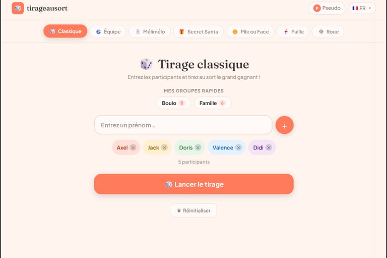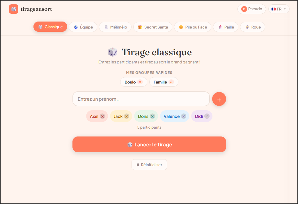 Des outils de tirage au sort, hasard, mélange d'équipe, un tirage au sort en ligne et à distance est disponible parfait pour les cadeaux...